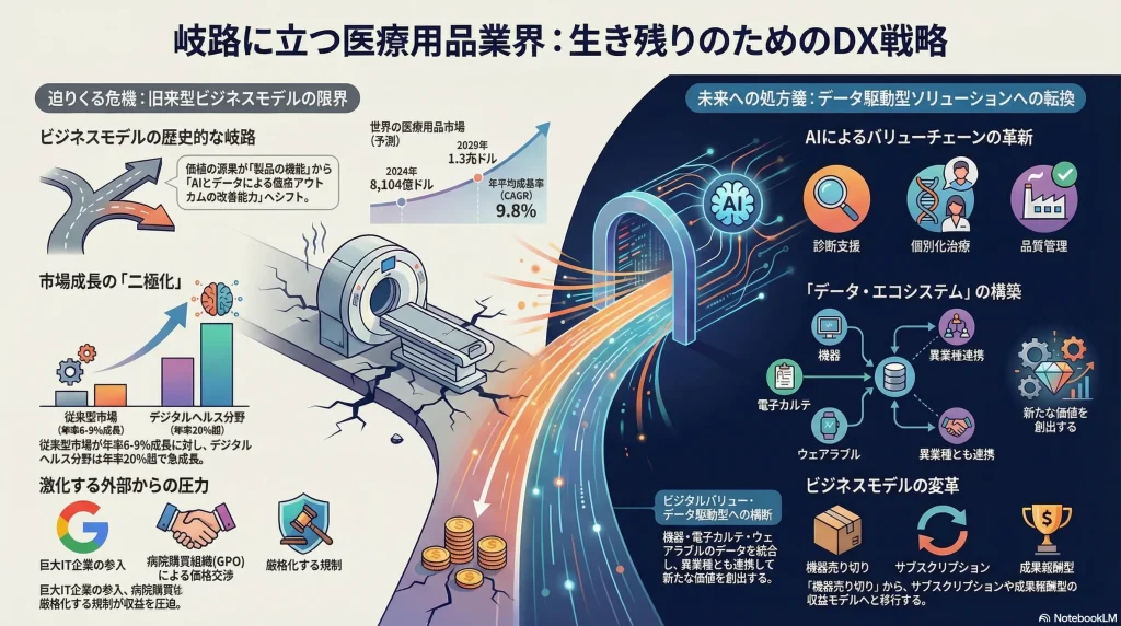 医療用品業界は、従来の「精密なハードウェア販売」というビジネスモデルから、「臨床アウトカムの改善を保証するソリューションプロバイダー」への転換という、歴史的な岐路に立たされています。価値の源泉は、製品の機能的優位性から、AIアルゴリズム、リアルワールドデータ、そしてそれらを統合して患者の治療成果(アウトカム)と医療システム全体の効率性を向上させる能力へと、不可逆的にシフトしています 2。このパラダイムシフトに適応できない企業は、熾烈な価格競争と製品のコモディティ化の波に飲まれ、市場からの淘汰を余儀なくされるという重大なリスクに直面しています。未来の勝者は、優れたハードウェアを製造するだけでなく、データを収集・解析し、実証可能な価値を医療システム全体に提供できる企業です。