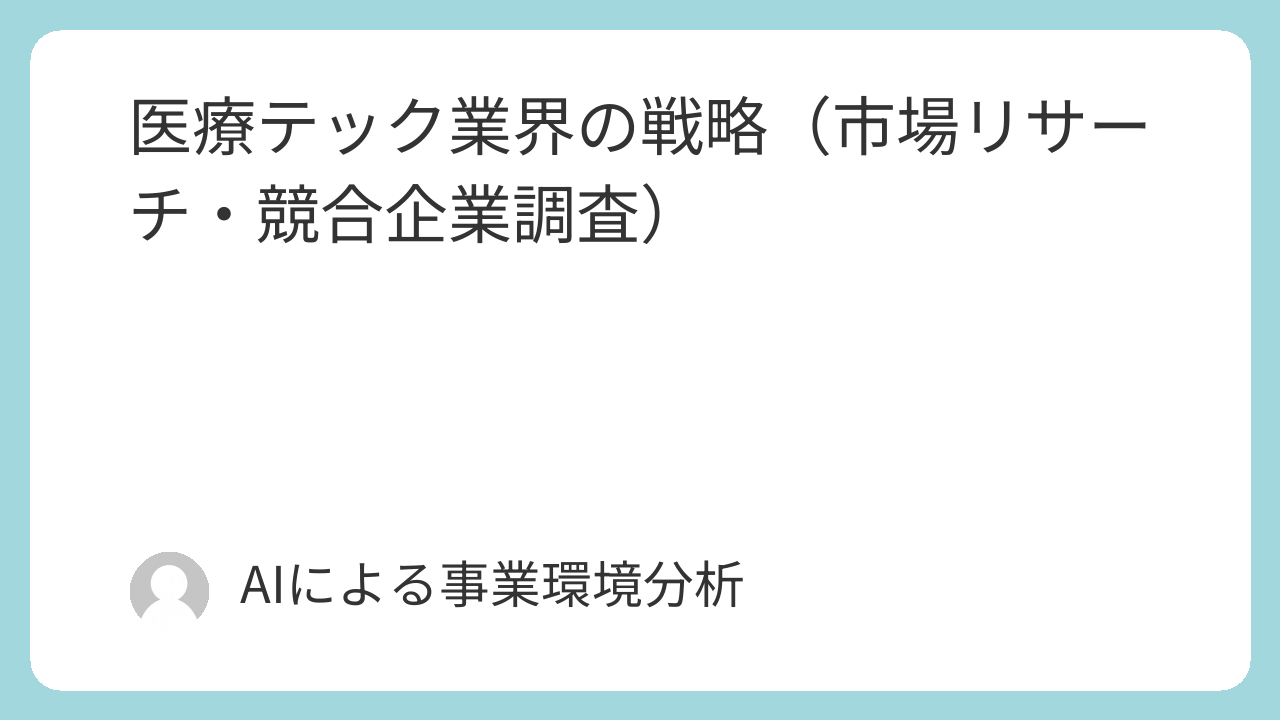本レポートは、技術、需要、規制が複雑に絡み合う変革期にある医療テック(HealthTech)業界について、包括的かつ深い分析を提供し、持続的な競争優位を確立するための事業戦略を提言することを目的とする。調査対象は、遠隔医療、AI診断支援、デジタルセラピューティクス(DTx)、PHR/ウェルネス管理、医療機関向けDX(電子カルテ/業務効率化)、創薬支援AIを主要領域とする。