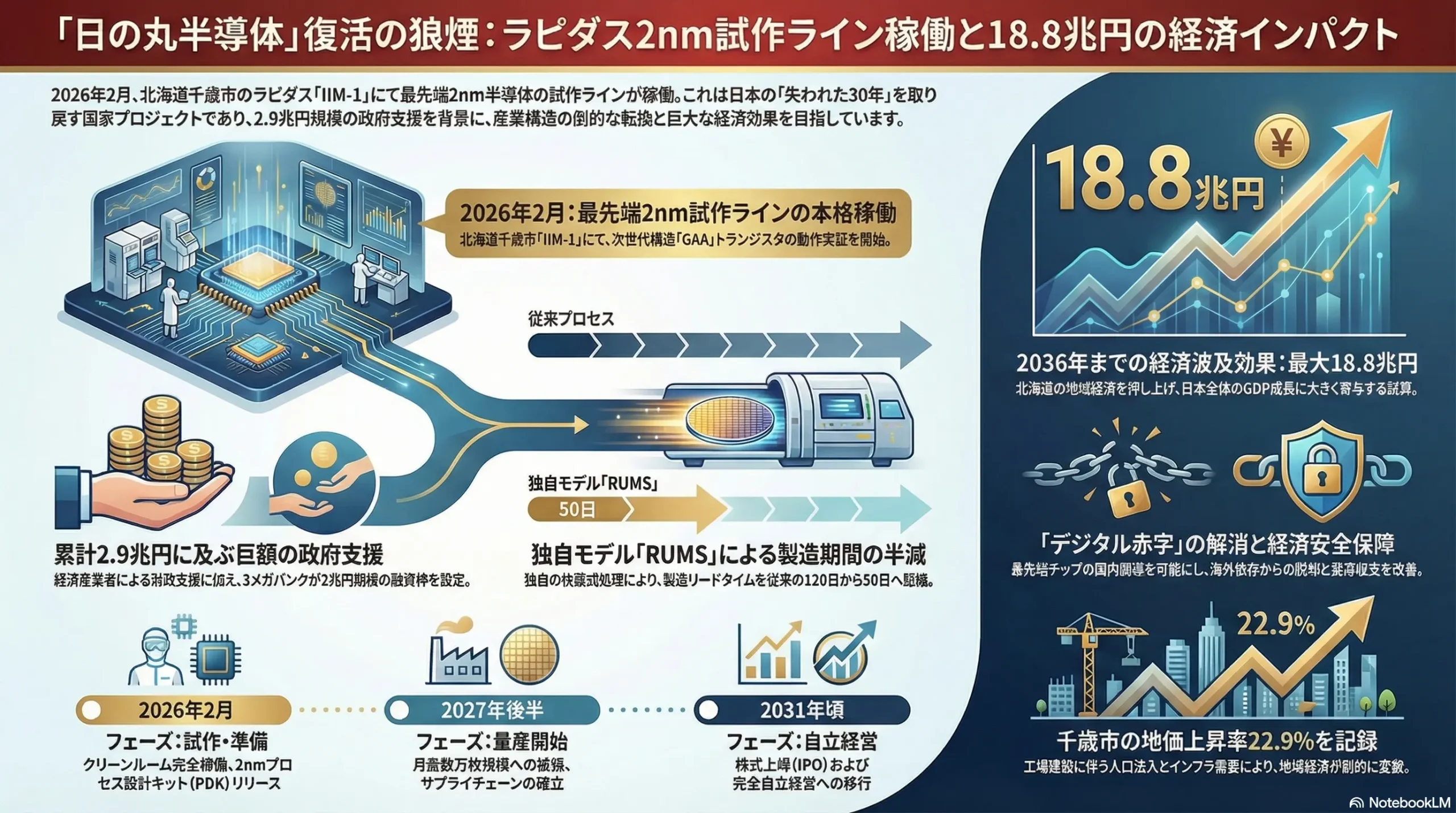 2026年2月、日本の半導体産業は長い停滞の冬を抜け、新たな黎明期を迎えたと言える。北海道千歳市に建設されたRapidus(ラピダス)株式会社の製造拠点「IIM-1(イーム・ワン)」において、最先端の2ナノメートル(nm)世代半導体試作ラインが本格稼働を開始したことは、単なる一企業の工場稼働というニュースを超え、日本の産業構造そのものが転換点を迎えたことを象徴している1。