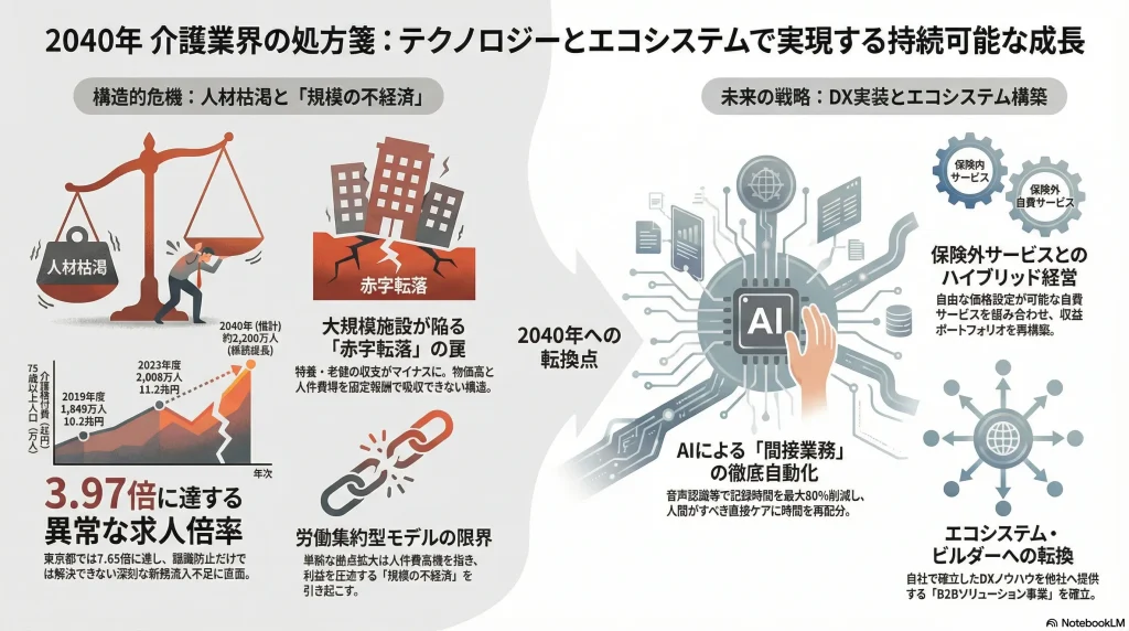 日本の介護サービス業界の未来は、従来の労働集約型モデルから、テクノロジーへの投資を軸とする「資本集約型」と、高度な専門性やデータ活用を軸とする「知識集約型」を融合させたハイブリッドモデルへ、いかに迅速に転換できるかにかかっている。