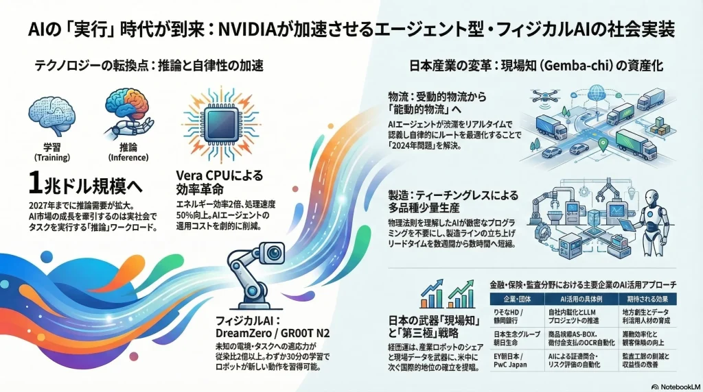 総じて、NVIDIAが牽引する推論特化型プロセッサとフィジカルAIの躍進は、日本の全産業に対してかつてない効率化とビジネスモデルの変革を迫っている。企業経営者は局所的なDXの枠組みを超え、エージェント・エコノミーを前提とした組織の再設計とデータガバナンスの確立に直ちに着手することが、次なる10年の経済競争を生き抜くための不可欠な条件である。