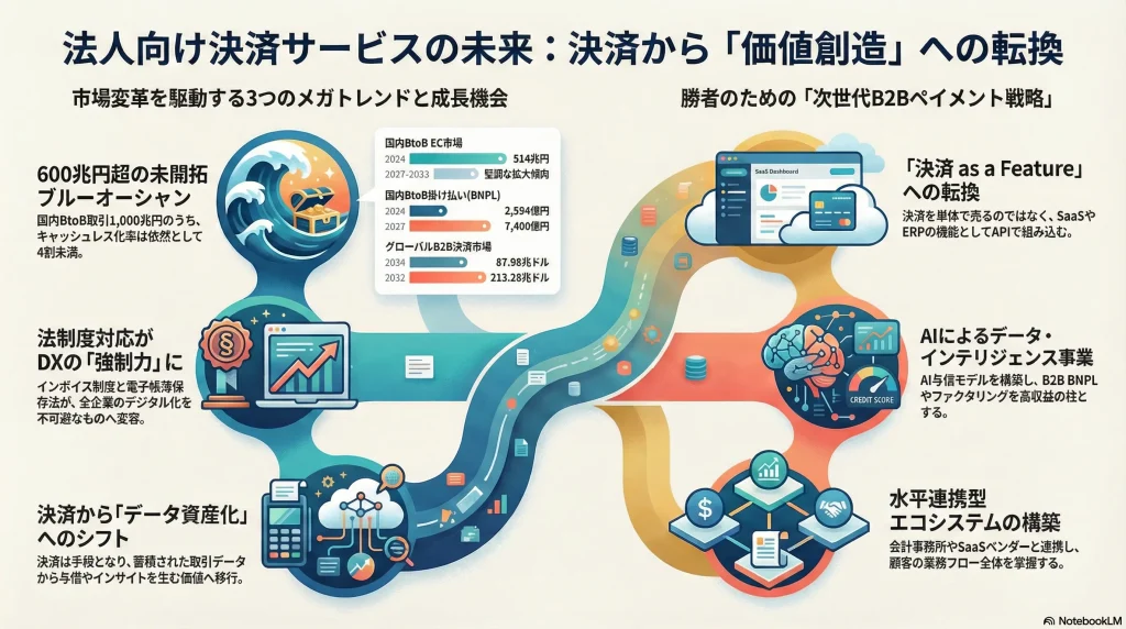 法人向け決済サービス市場における競争の主戦場は、単なる取引処理(プロセッシング)の効率化から、蓄積された膨大な決済データを活用した「新たな価値創造」へと完全に移行している。この不可逆的な地殻変動は、以下の3つのメガトレンドによって複合的に駆動されている。