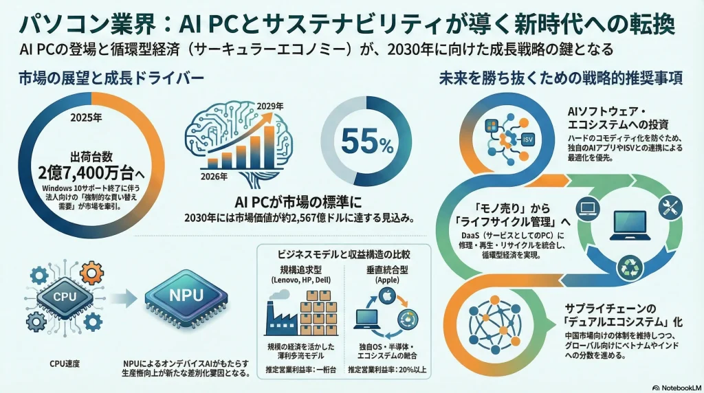一方で、Appleは独自のmacOSと強力なソフトウェア・サービスエコシステムを構築することで、ハードウェアの価格競争から一線を画し、20%を超える高い営業利益率を維持している。これは、価値の源泉がハードウェアそのものから、それを取り巻く体験やエコシステムへとシフトしていることを象徴している。AI PC時代においては、この傾向がさらに加速し、ソフトウェアやAI体験で差別化できないメーカーは、さらなる利益率の低下に直面するリスクがある。
