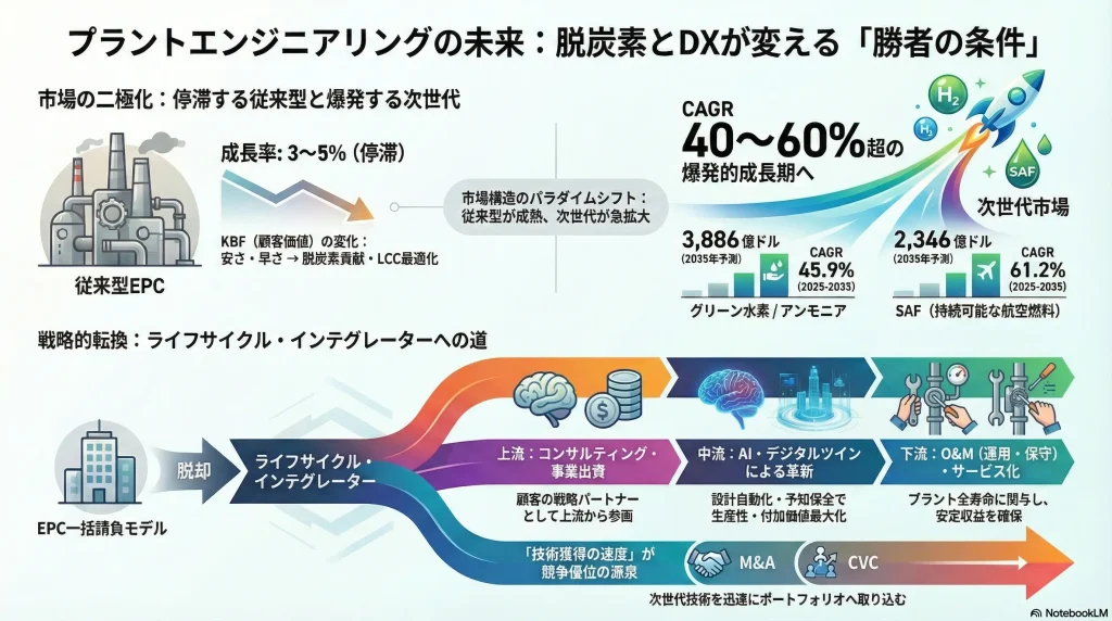 プラントエンジニアリング業界の市場環境は、二極化が急速に進行している。従来型のEPC(Engineering, Procurement, and Construction)市場が年平均成長率(CAGR)3~5%台の緩やかな成長に留まる一方、グリーン水素やSAFなどの次世代プラント市場はCAGR 40~60%台という爆発的な成長期に突入している 1。この構造転換は、エンジニアリング企業に対し、既存事業でキャッシュを創出しつつ、それを大胆に成長事業へ再投資するという「両利きの経営」を強いる戦略的ジレンマを生み出している。