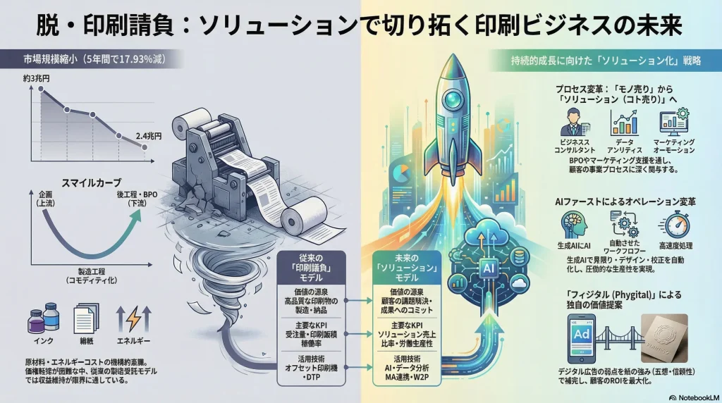 しかし、この構造変化の中にこそ、新たな価値創出の機会が存在する。その核心は、顧客の事業プロセスに深く関与し、マーケティング活動や業務効率化といった経営課題そのものを解決する「ソリューション(コト売り)」への全面的な転換である。経済産業省の統計が示す「製造品出荷額(約5兆円)」と企業単位の「売上高(約7.5兆円)」の間に存在する約2.5兆円もの乖離 2 は、大手印刷企業が既に印刷以外のソリューション事業で巨大な収益を上げている動かぬ証拠であり、業界の価値源泉がどこにシフトしているかを明確に物語っている。
