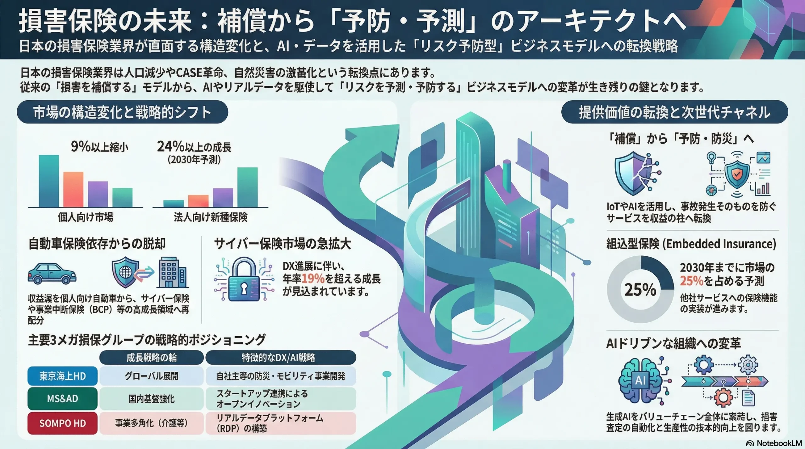 1. 事業ポートフォリオの再定義と戦略的資源配分: 構造的に縮小する個人向け自動車保険市場への過剰な依存から脱却する。サイバー保険、事業中断保険(BCP)、ウェルネス関連など、高成長が見込まれる法人向けリスクソリューション領域へ、人材・資本・IT投資といった経営資源を大胆に再配分する。