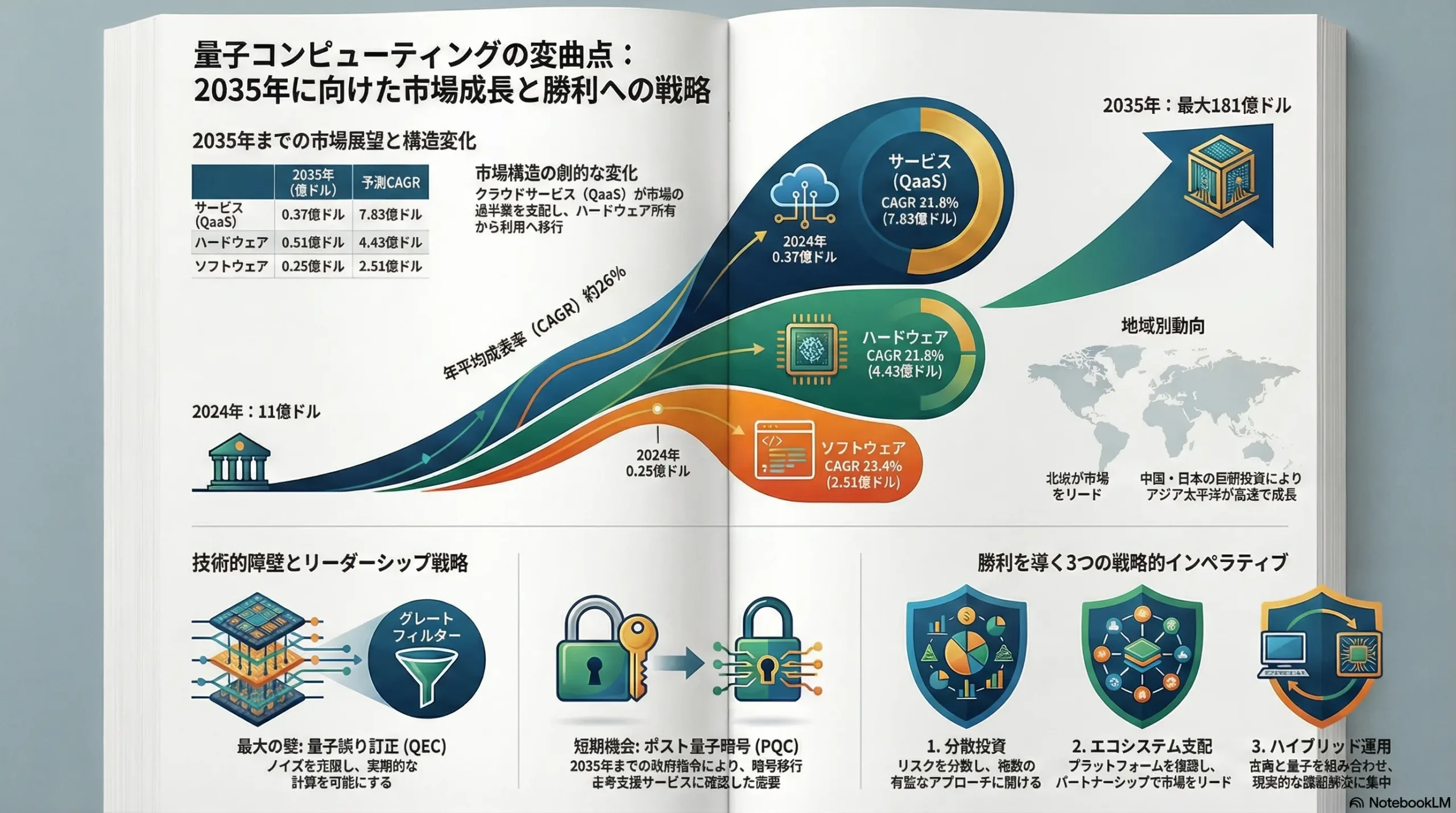 量子コンピューティング業界は、学術的な研究開発段階から商業的な価値創出を目指す重要な「変曲点」に到達しました。2024年時点で約11億米ドルと評価される市場は、2035年までに最大180億米ドルを超える規模へと指数関数的な成長を遂げると予測されています。この成長は、金融、製薬、物流といった主要産業における複雑な問題解決への期待と、各国政府による大規模な戦略的投資によって牽引されています。