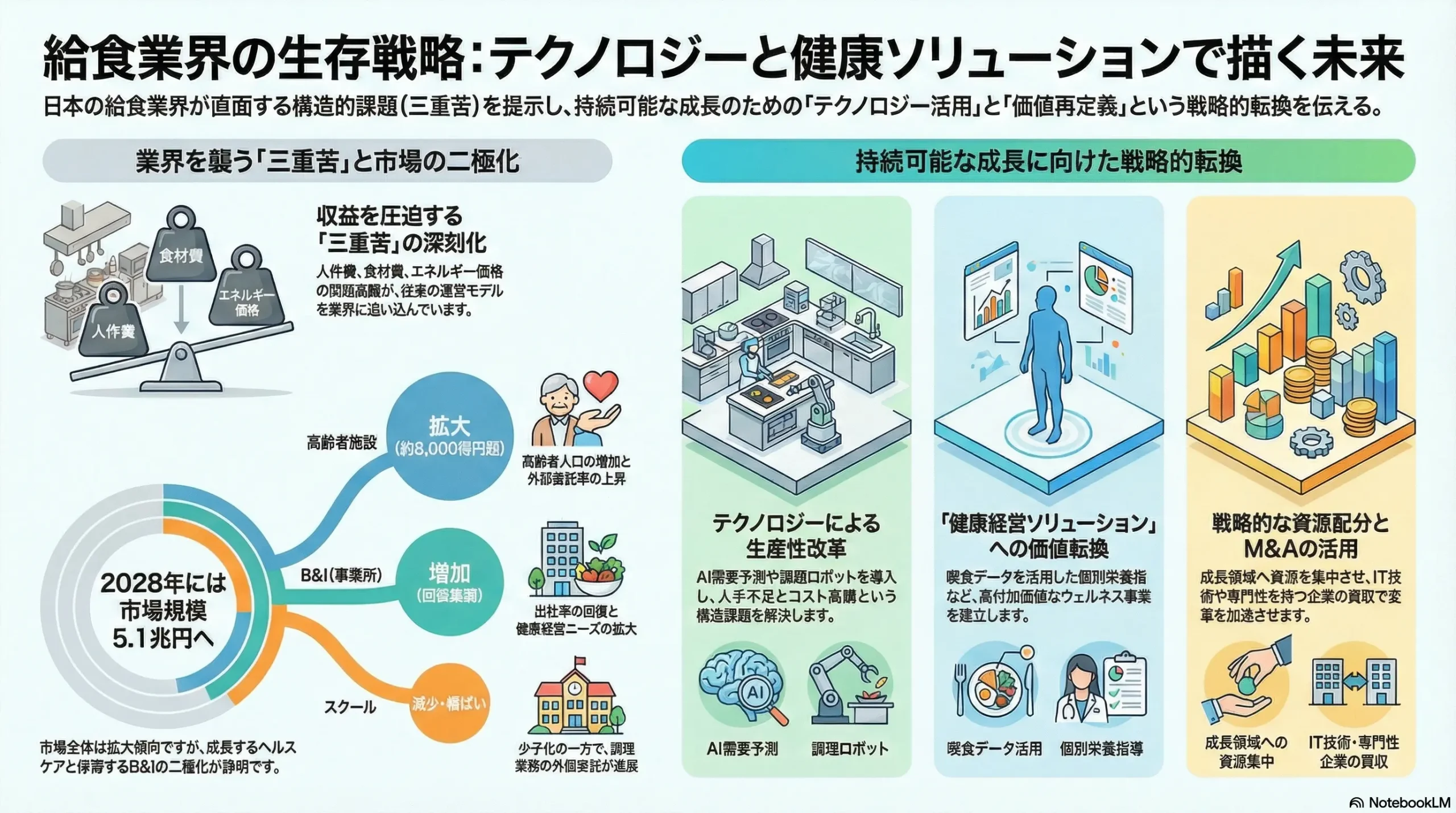 給食業界は、①少子高齢化とリモートワーク定着による需要構造の二極化(ヘルスケア市場の拡大とB&I市場の不確実性)、②人件費の構造的な高騰、③食材費・エネルギー価格の高騰という「三重苦」に苛まれ、従来の労働集約型ビジネスモデルは限界に達している。この厳しい環境下で生き残るための鍵は、単なるオペレーショナル・エクセレンス(現場改善)の追求から、「テクノロジー主導の抜本的な生産性改革」と、「健康ソリューションという高付加価値提供」への大胆な転換にある。市場機会は明確に二極化しており、成長領域であるヘルスケア市場における専門性の深化と、全セグメントに共通して求められる圧倒的なコスト競争力の確立が、将来の勝者と敗者を分けることになる。