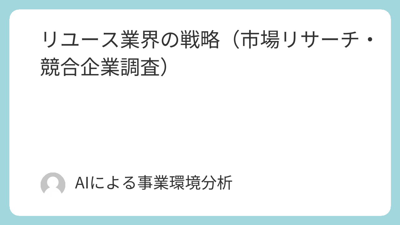 本レポートは、リユース・リサイクル業界が直面する構造変化、すなわちC2C(消費者間取引)プラットフォームの台頭とAI技術の進化という二つのメガトレンドを深く分析し、企業が持続的な競争優位を確立するための次世代事業戦略を提言するものである。調査範囲は、総合リユース、専門リユース(ブランド品、アパレル、ホビー等)、オンラインおよびオフラインチャネル、そして関連するC2Cプラットフォーム市場を網羅する。
