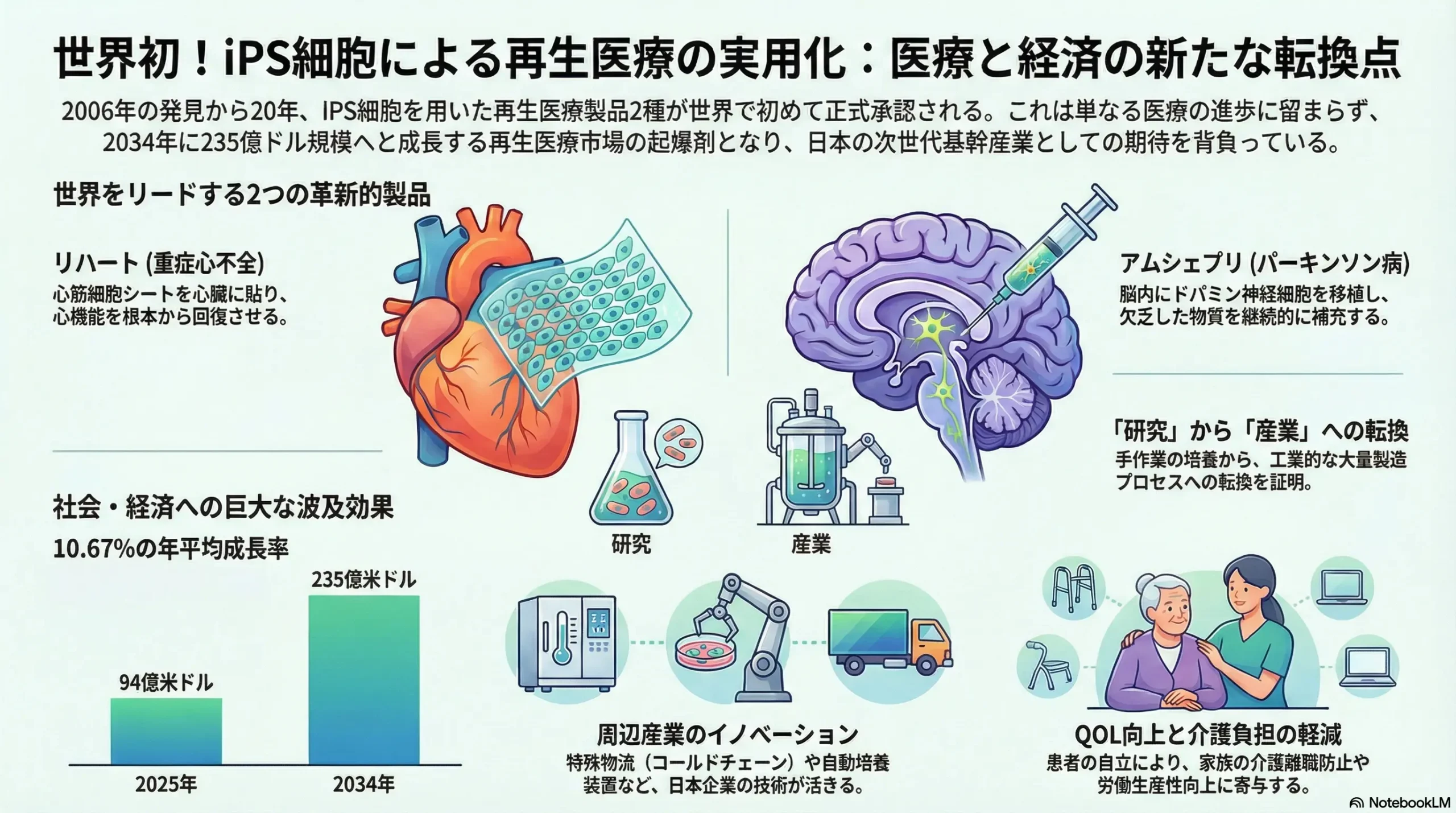 iPS細胞由来製品の本格的な実用化は、日本のマクロ経済および景気動向に対して、直接的な市場拡大効果、周辺産業への波及効果、そして医療経済学的な構造変化という多層的な影響をもたらすことが予想される。