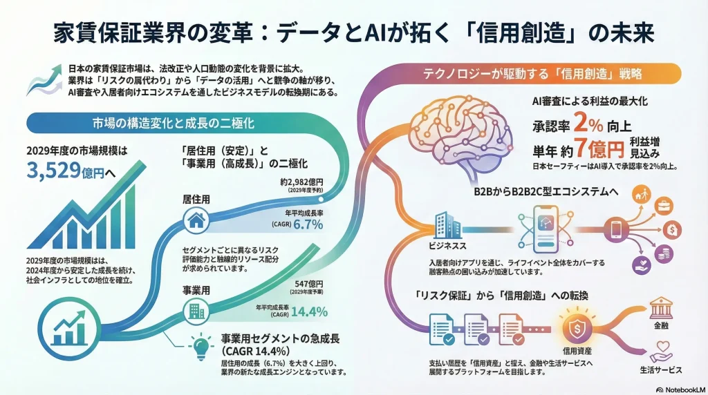 - 市場の二極化と持続的成長: 家賃保証市場は、2029年度には3,529億円規模に達すると予測される安定成長市場です 1。しかしその内実は、成熟しつつある居住用セグメント(年平均成長率約6.7%)と、ワークスタイルの多様化を背景に急成長する事業用セグメント(同約14.4%)へと明確に二極化しています 2。この構造変化は、画一的な戦略では市場機会を捉えきれないことを示唆しています。