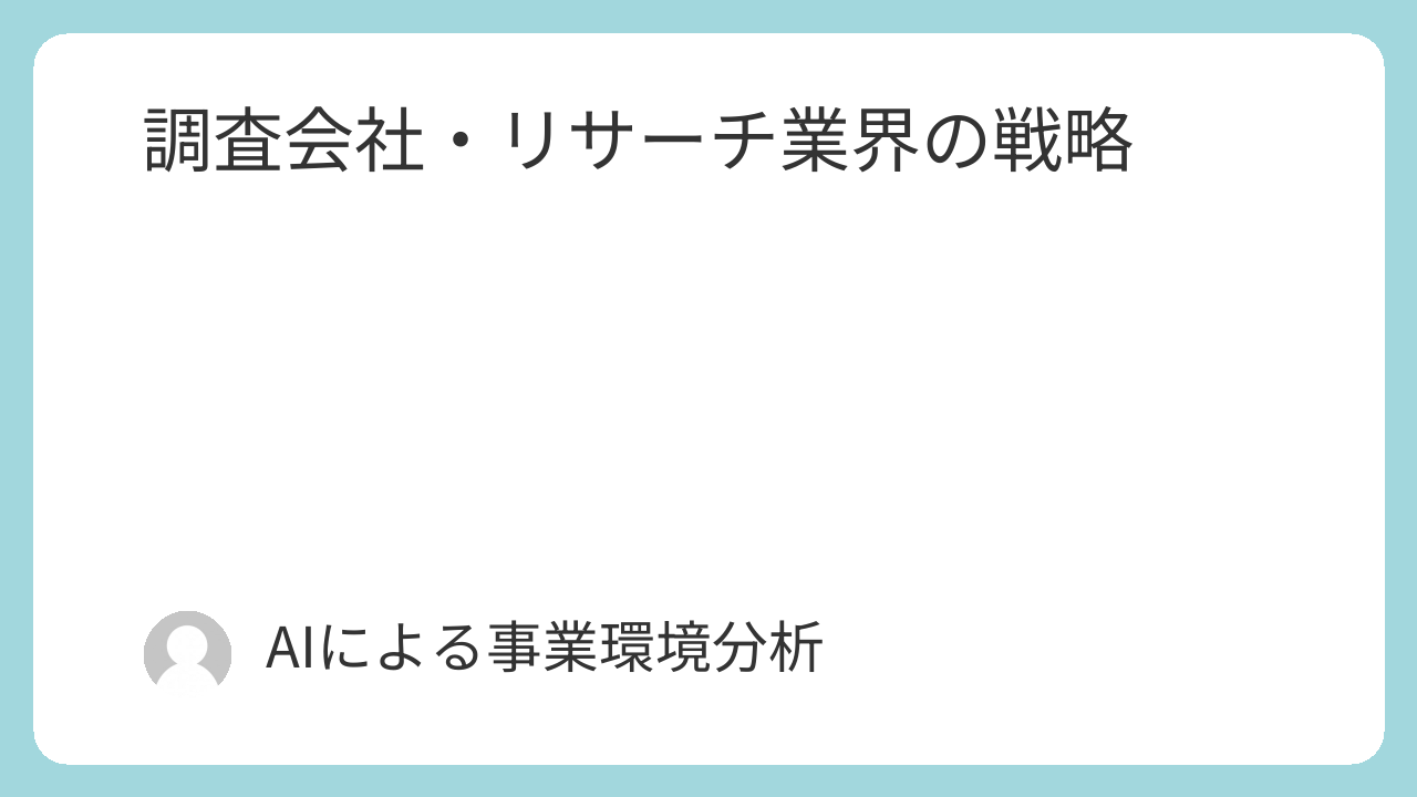 - DIYツールによる内製化: 最も直接的かつ深刻な代替品は、クライアント自身がDIYツールを用いて調査を内製化することである 38。これにより、カスタムリサーチの多くの領域が代替されうる。