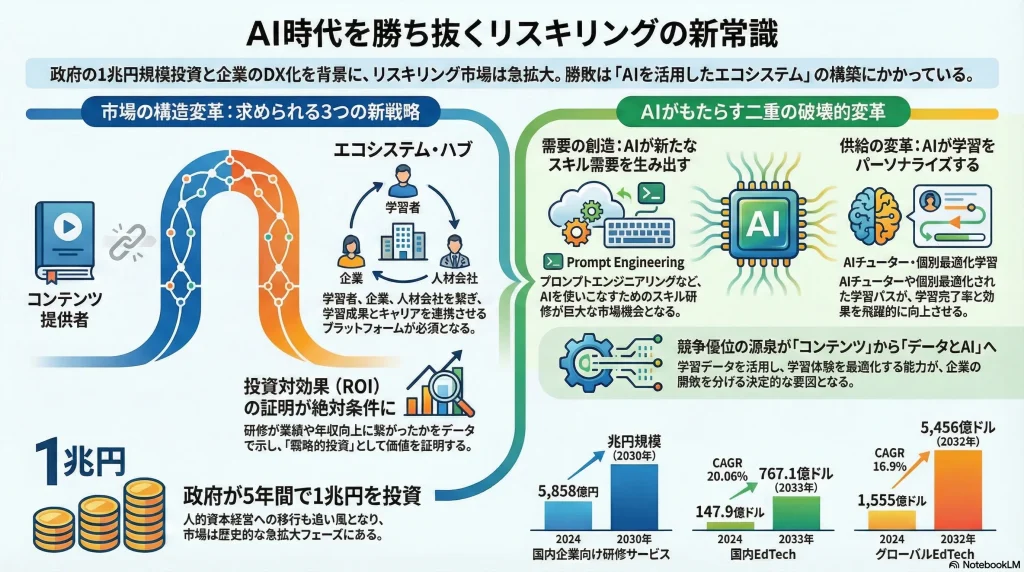 これらのデータを総合すると、リスキリング関連市場は国内外で巨大な成長ポテンシャルを持つことが確認できる。特に、テクノロジーを活用した学習形態(eラーニング、EdTech)がグローバルな成長を牽引しており、日本の市場もこの潮流に追随していくと考えられる。