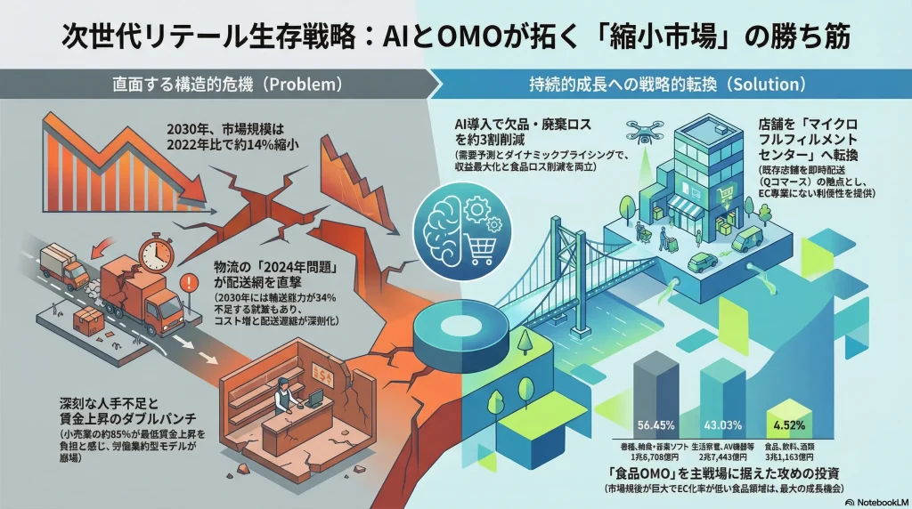 - 「縮小均衡市場」への突入とゼロサムゲーム化: 日本の小売市場は、人口減少という不可逆的なトレンドを背景に、2030年までに2022年比で約14%縮小する「縮小均衡市場」に突入する 1。この環境下における成長とは、市場全体の拡大によるものではなく、競合他社のシェアを奪う「ゼロサムゲーム」に勝利することを意味する。従来の延長線上にある戦略は、緩やかな衰退を約束するに等しい。
