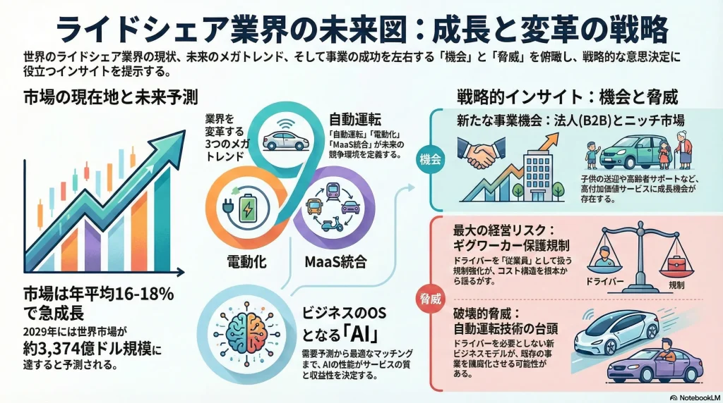 ライドシェア市場は、COVID-19パンデミックによる一時的な落ち込みから力強く回復し、今後5年間で年平均成長率(CAGR: Compound Annual Growth Rate)が10%台後半という持続的な成長が見込まれる。この成長は、都市化の進展、スマートフォンの普及、そして「所有から利用へ」という消費者価値観の変化に支えられている。長期的には、自動運転、電動化、そしてMaaS(Mobility as a Service)との統合が業界を根本的に変革する重要な潮流となる。