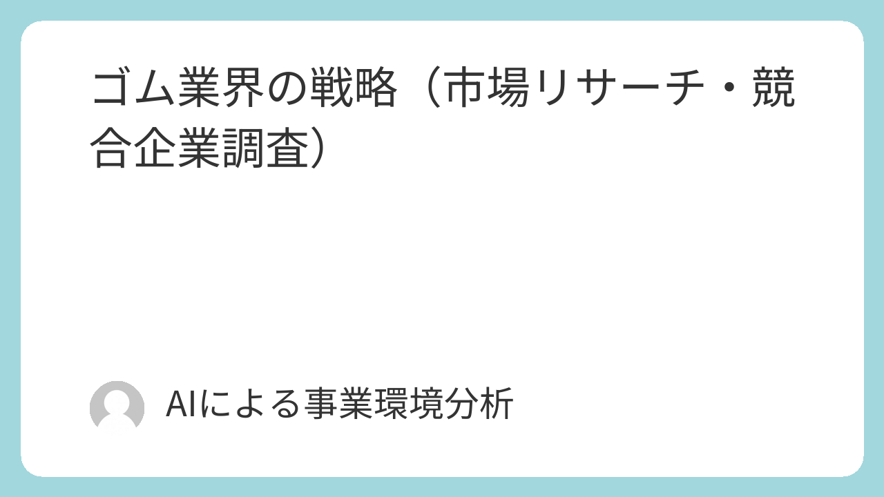 - 代替材料との競合: 特定の用途、特に工業製品分野では、高機能な樹脂やプラスチックがゴムの代替材料として競争圧力となっています 2。これらの代替材料は、軽量性やコスト面で優位性を持つ場合があります。