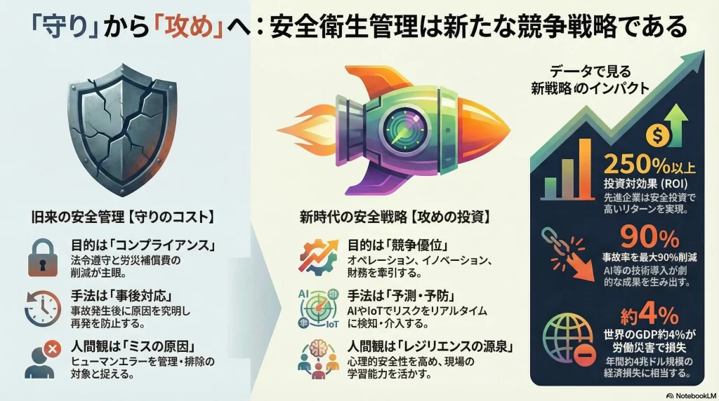 2020年代半ば、世界の産業界は安全衛生管理(EHS: Environment, Health, and Safety)における歴史的なパラダイムシフトの渦中にある。長らく、安全管理は「コンプライアンス(法令遵守)」と「コスト抑制(労災補償費の削減)」を主目的とする、必要悪としてのコストセンターと見なされてきた。しかし、デジタル技術の爆発的な進化、ESG(環境・社会・ガバナンス)投資の定着、そして労働市場の構造的な逼迫は、この領域を企業の持続的成長と競争優位の源泉へと変貌させた。本レポートにおける包括的な調査と分析が示す結論は明白である。EHSはもはや「守りの盾」ではなく、オペレーショナル・エクセレンス(卓越した業務遂行)、イノベーション、そして財務パフォーマンスを牽引する「攻めの投資領域」である。