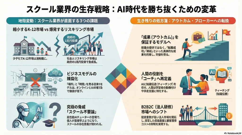 日本のスクール業界は、従来の「場所」と「時間」を切り売りするスペース・ブローカーモデルから、学習者の「成果(アウトカム)」を保証し、その対価を得るアウトカム・ブローカーモデルへの転換という、不可逆な岐路に立たされている。この転換の成否が、今後5年から10年における業界の勝者と敗者を明確に分かつ決定的な要因となる。