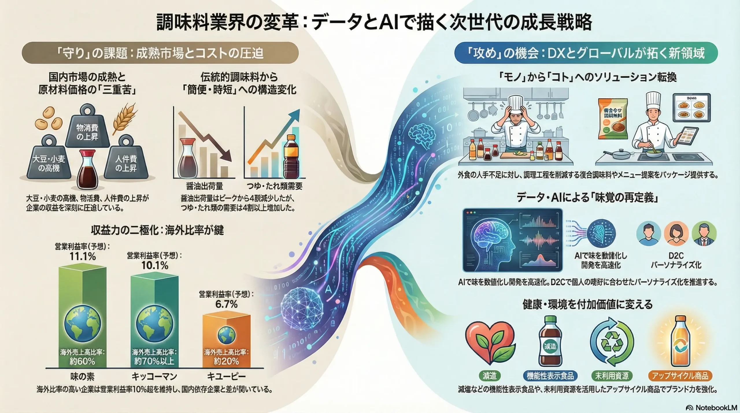 日本の調味料業界は、国内市場の成熟と原材料高騰という深刻な「守りの課題」と、健康・簡便・パーソナライズ化という大きな「攻めの機会」が複雑に交錯する転換点にある。この環境下で、業界の勝者と敗者を分ける決定的な要因は、伝統的な「モノ(製品)」を製造・販売するビジネスモデルからいかに迅速に脱却し、データとテクノロジーを駆使して「コト(ソリューション・体験)」を提供する新たな価値提供モデルへと変革を遂げられるか、という点に集約される。もはや、伝統的な製法やブランド力のみで持続的成長を担保することは困難であり、事業のあらゆる側面でデジタル技術を統合し、顧客価値を再定義する能力が問われている。