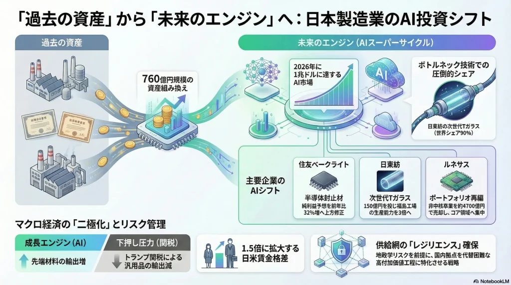 これら二つの潮流——すなわち、「資本の流動化と次世代領域への再配分」と「AI・半導体需要の構造的定着」——は、互いに密接に絡み合っている。米国市場をはじめとするグローバル経済の不確実性が高まる中で、日本企業は従来型の汎用製品の輸出モデルから脱却し、AIデータセンターの基盤となる高付加価値な先端材料や製造装置、電源・蓄電インフラの供給者としての地位を確立しようとしている。本レポートでは、この複雑に絡み合うマクロ経済の動向とミクロの企業行動を解き明かし、日本経済、特定産業、個人の生活、そして企業経営に及ぼす影響を多角的な視点から詳細に分析する。