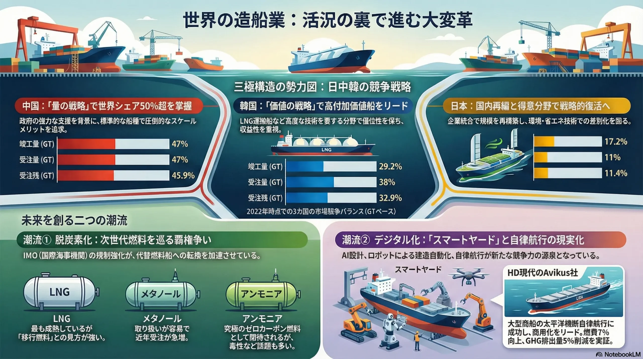 世界の造船市場は、中国、韓国、日本の三カ国による寡占状態が続いている。中国は、政府の強力な支援を背景に、建造量(総トン数)で世界シェアの50%超を掌握し、圧倒的なスケールメリットを追求している 2。一方、韓国はLNG運搬船などの高付加価値船市場における技術的優位性を維持し、価値ベースでの競争をリードしている 4。かつての覇者である日本は、シェアを落としながらも、国内での企業再編(今治造船とジャパンマリンユナイテッドの経営統合など)を通じて規模の経済を再構築し、戦略的な復活を目指している 6。この三極間の競争は、単なる市場シェア争いから、技術覇権、地政学的連携、そして国家戦略が複雑に絡み合う新たな次元に移行している。