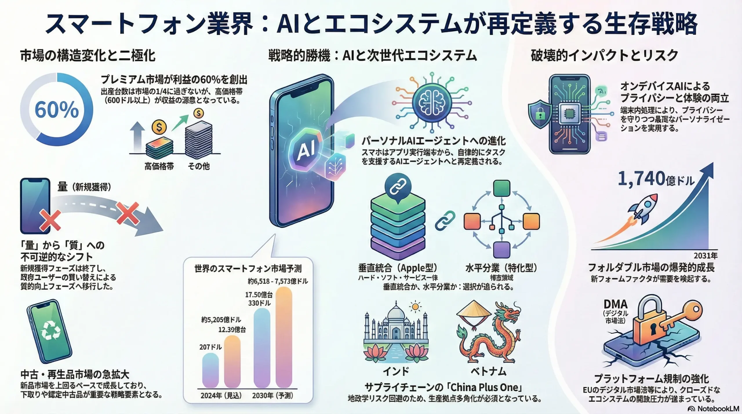 | グローバル市場シェア(金額ベース) | プレミアム市場(>600ドル): 1. Apple (71%) 2. Samsung (17%) 3. Huawei (5%) 2 | 利益の大部分はAppleが独占。Samsungはフォルダブルで差別化を図り、Huaweiは中国国内のプレミアム市場で復活。利益創出にはプレミアム市場での成功が不可欠であることを示唆。 |