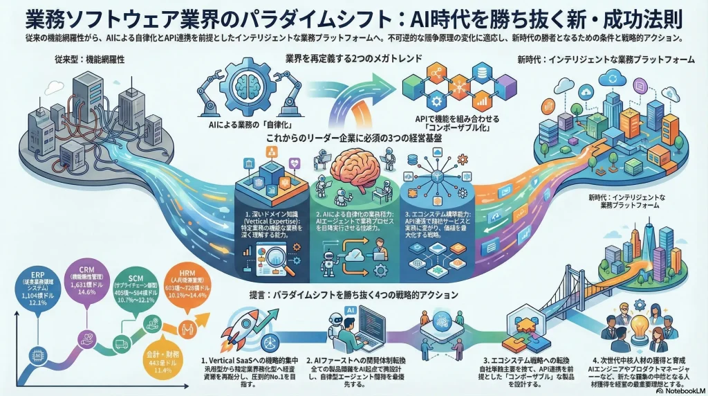 業務ソフトウェア業界の競争原理は、機能の網羅性や価格といった従来の軸から、顧客のビジネス成果に直接貢献する「インテリジェントな業務プラットフォーム」の提供能力へと、不可逆的に移行しています。この新たな競争次元において、市場の勝者となるのは、以下の三つの要素を統合的に獲得した企業です。