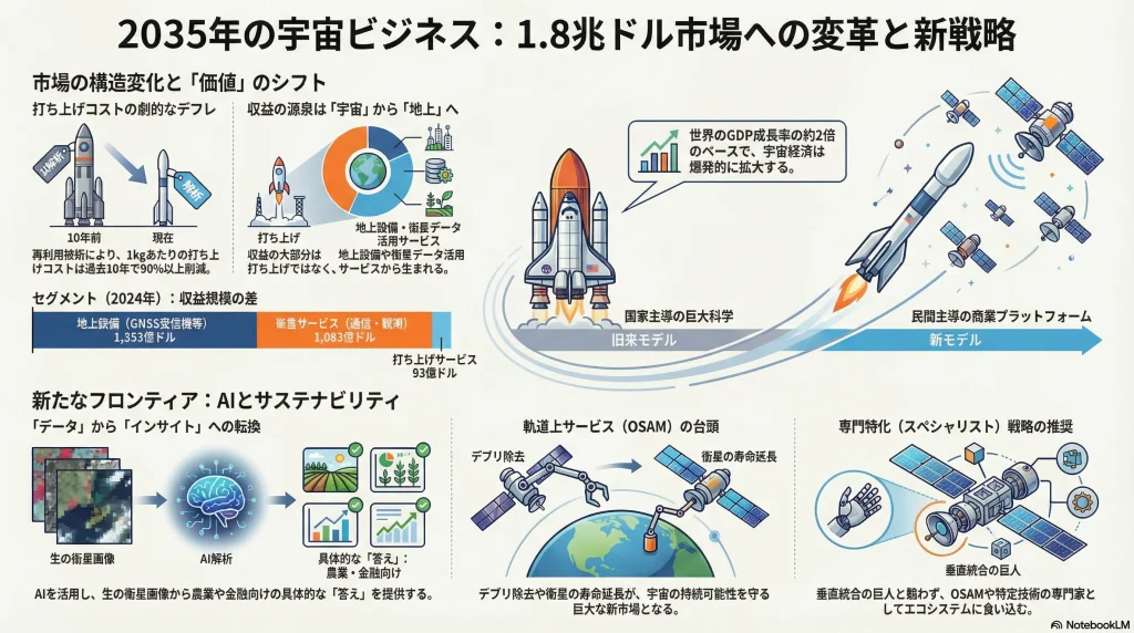 これらのトレンドが複合的に作用し、宇宙はもはや「特別な場所」ではなく、通信、金融、農業、気候変動対策といった社会経済活動を支える「基盤インフラ」としての役割を担いつつある。このダイナミックな環境下で成功を収めるには、従来のハードウェア中心の思考から脱却し、データと持続可能性を核とした事業戦略へと転換することが不可欠である。