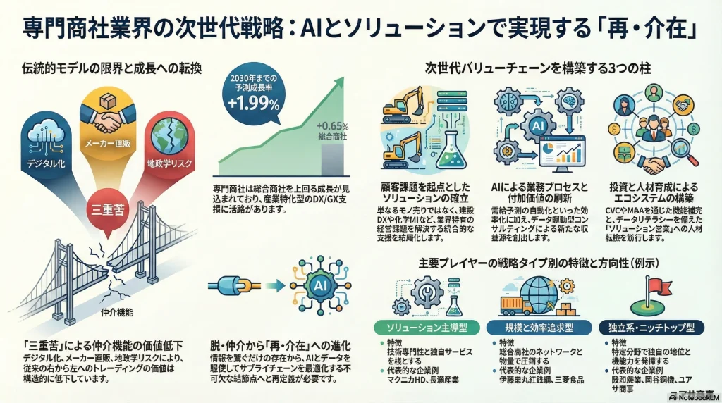 本レポートは、PESTLE分析やファイブフォース分析などのフレームワークを用いて外部環境、業界構造、および主要プレイヤーの戦略を徹底的に分析した。その結果、専門商社が持続的な成長を遂げるための鍵は、単なる「モノの仲介」から、顧客の経営課題(デジタルトランスフォーメーション、グリーントランスフォーメーション)を解決する「機能(ソリューション)」の提供と、将来の価値を創造する「事業投資(プリンシパル投資)」へと、ビジネスモデルを根本的に変革することにあると結論付ける。