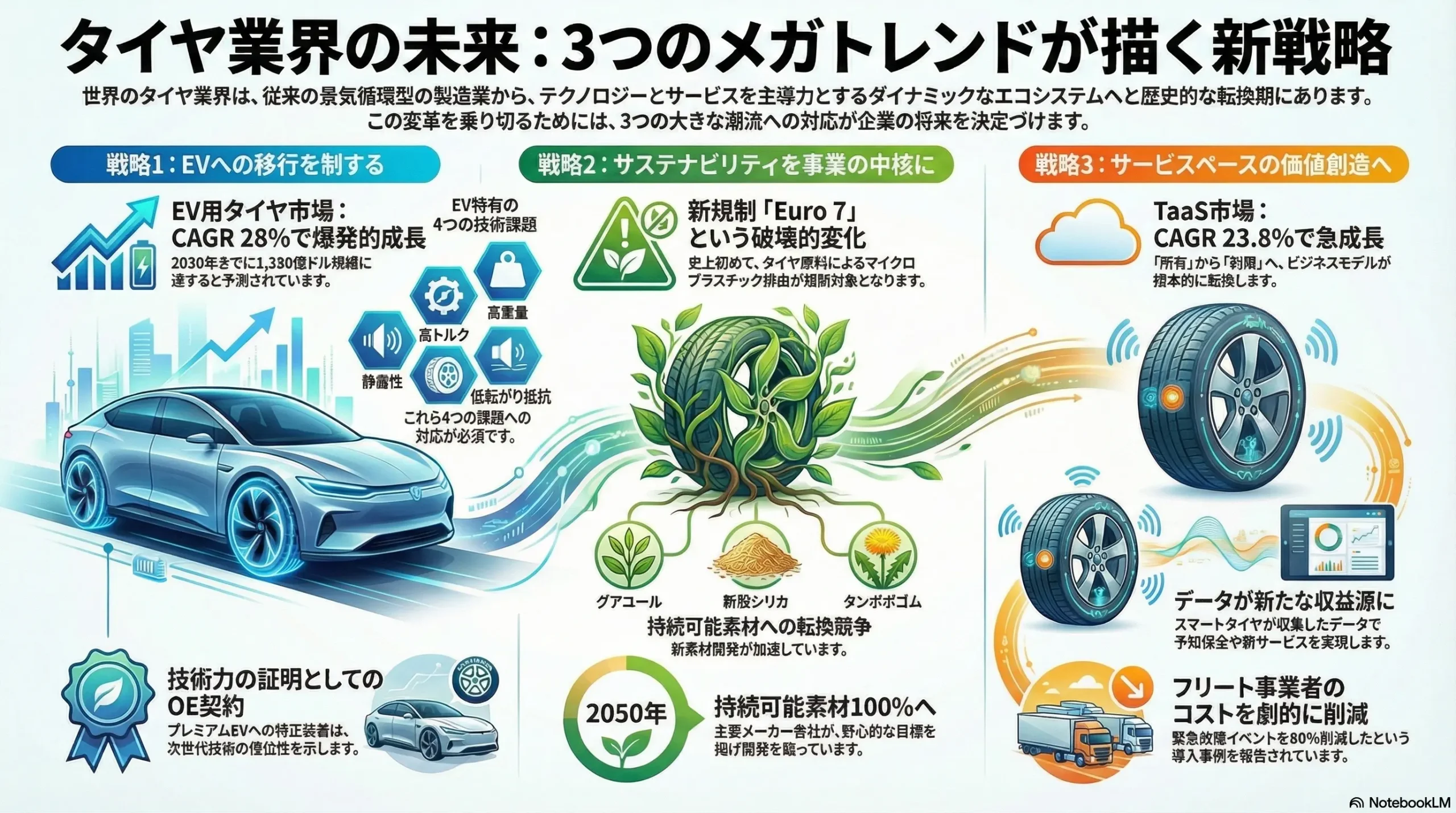 分析の結果、今後のタイヤ業界における企業の成功は、以下の3つの戦略的必須事項への対応能力によって決定されると結論付けられる。