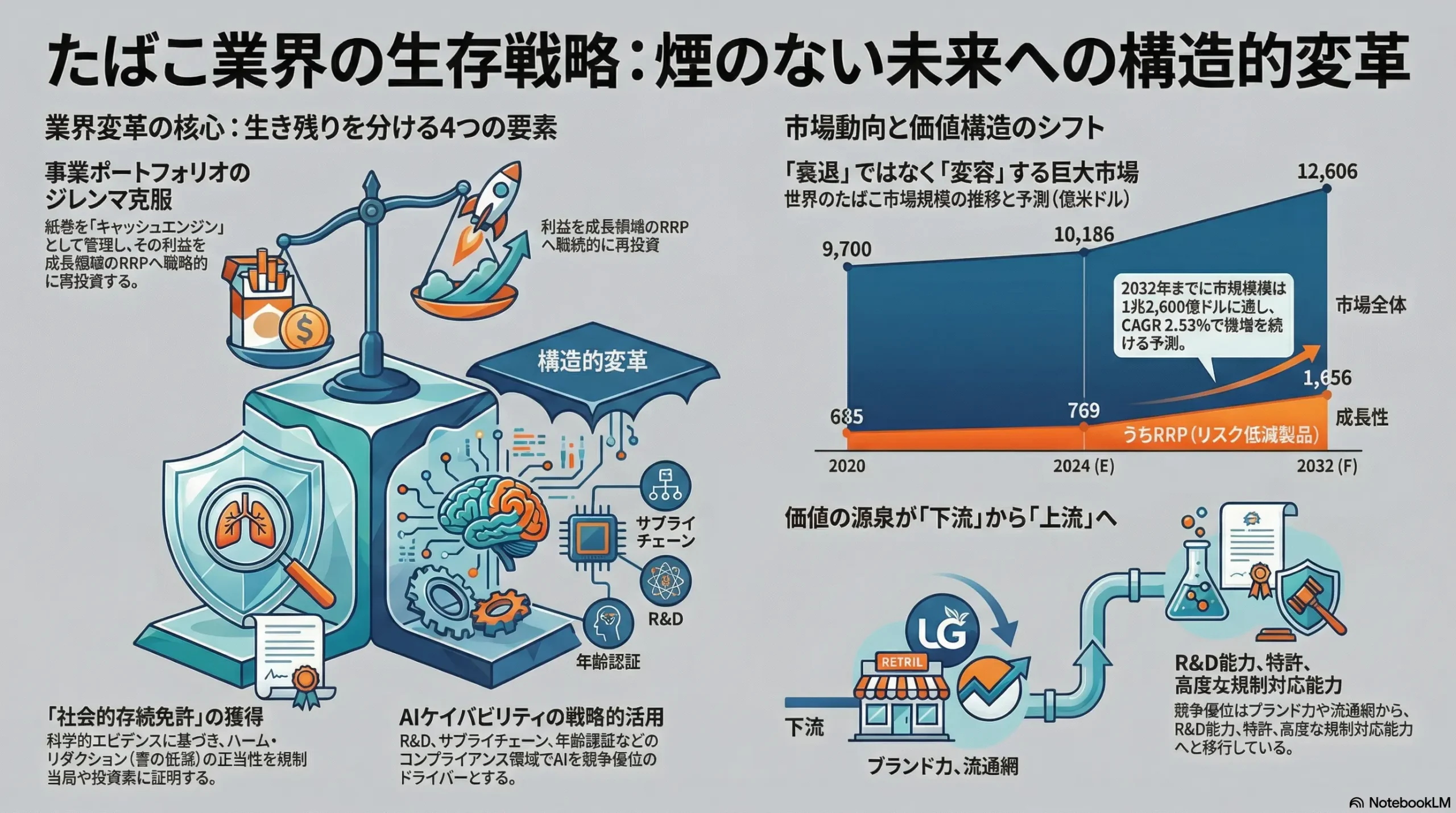 - 事業ポートフォリオのジレンマの克服: 業界は、依然として巨大なキャッシュを生み出すが縮小する紙巻たばこ事業と、巨額の先行投資を要するが成長を牽引するRRPs事業との間で、リソース配分のジレンマに直面している。このジレンマを克服し、紙巻事業を「キャッシュエンジン」として規律をもって管理し、そのキャッシュをRRPsの成長へ戦略的に再投資する能力が、企業の将来を決定づける。