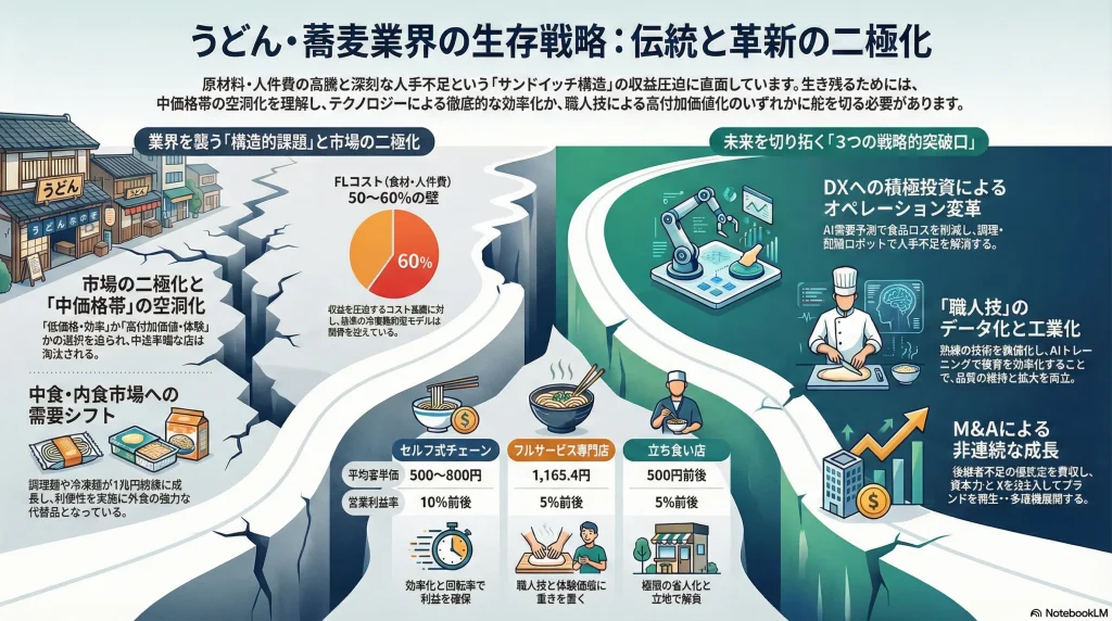 1. 市場の二極化と「中価格帯」の空洞化: うどん・蕎麦市場は、「低価格・効率追求型」と「高付加価値・体験型」へと明確に二極化が進行している。コスト上昇圧力と、消費者の「安さ・速さ」または「本物志向・体験価値」へのニーズの先鋭化により、両者の中間に位置する特徴の曖昧なプレイヤーは競争優位を失い、淘汰される「ミドルマーケットの空洞化」が不可逆的に加速している。