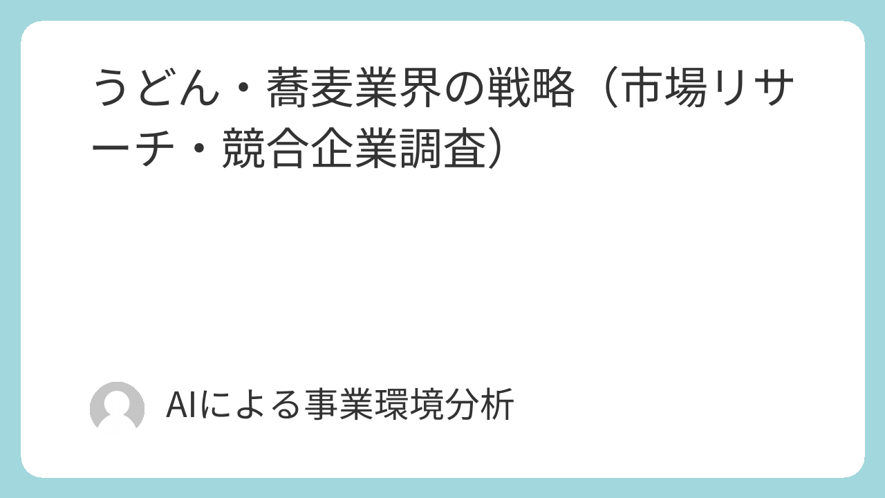 本レポートは、日本の外食産業において成熟市場と見なされる「うどん屋・蕎麦屋」業界における新たな事業戦略(新規参入、既存事業の変革、M&Aなど)の策定を目的とする。現在、当業界は①原材料費・エネルギーコストの高騰、②深刻な人手不足と人件費の上昇、③消費者のニーズの二極化、④デジタル化・自動化の遅れという、複合的かつ構造的な課題に直面している。これらの課題を乗り越え、持続的な成長を達成するための戦略的選択肢を、データに基づき網羅的に分析・提言する。