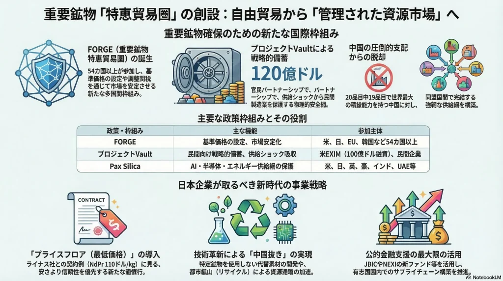 特恵貿易圏は、自由貿易から「管理された資源市場」への移行である。中国の寡占を是正し、新たな多国間枠組みFORGEを通じて、同盟国間で完結する強靭な供給網の確立を目指す。