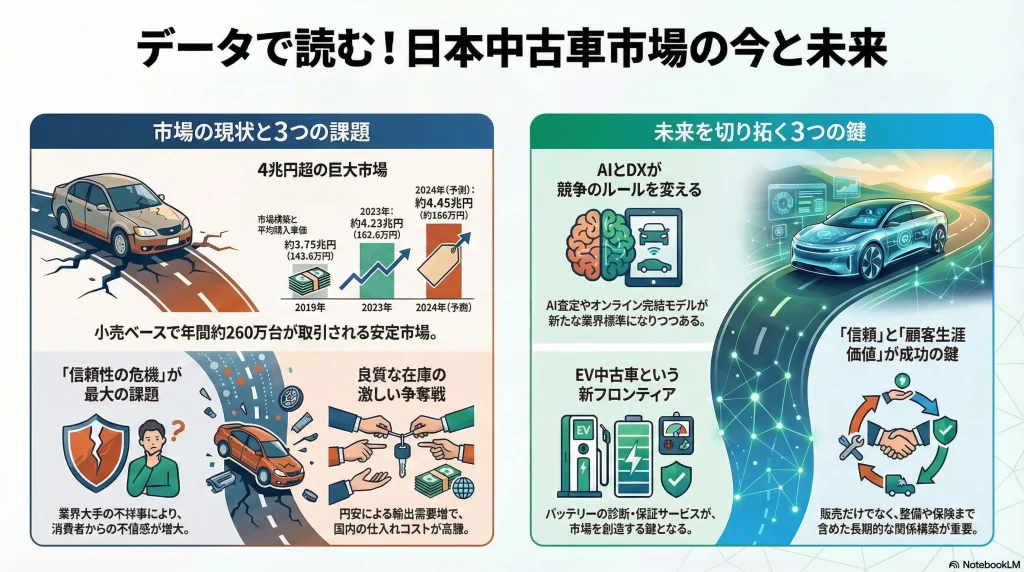 日本の中古車市場は、小売ベースで年間約260万台、金額ベースで約4兆円を超える巨大市場である 1。近年、新車価格の高騰や半導体不足に起因する納期遅延を背景に中古車需要が高まり、平均購入単価も上昇傾向にある 3。今後5年間も、デジタル化の進展や付加価値サービスの拡充を追い風に、年平均成長率(CAGR)6%前後の堅調な成長が予測されている 6。しかし、その内実では、少子高齢化による国内需要の構造的縮小圧力、業界全体の信頼性低下、そして深刻な人材不足といった課題を抱える転換期にある。