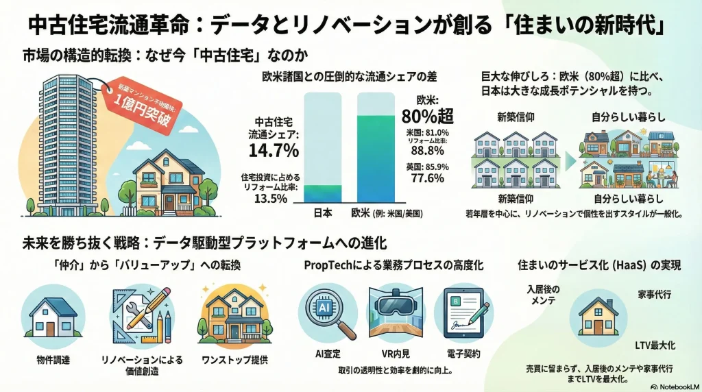 したがって、今後の事業戦略の核心は、単なる仲介手数料ビジネスからの脱却に置かれなければならない。真の成長機会は、「中古物件の調達」と「リノベーションによる価値創造」をいかにシームレスに結合し、顧客にワンストップで提供できるかにかかっている。そして、欧米諸国に比べて極端に低い日本の流通シェアは、市場がいまだ未成熟であることの証左であり、市場構造が変革されれば、現在の数倍規模にまで拡大する爆発的なポテンシャルを秘めていることを示している。