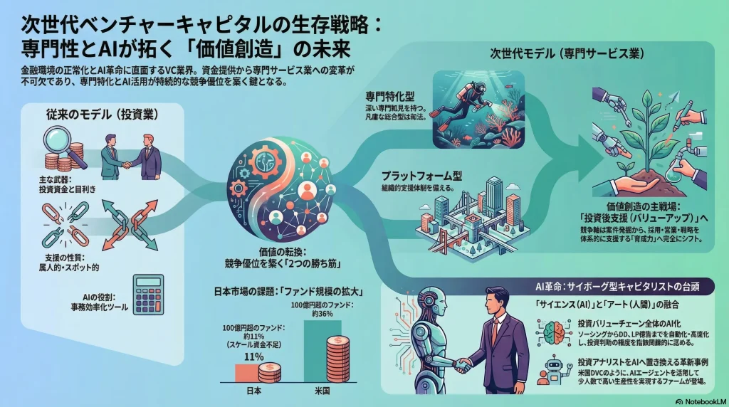 - 価値創造の主戦場シフト: VCの競争における主戦場は、ディールソーシング(案件発掘)の優位性から、投資後のバリューアップ(成長支援)能力へと完全に移行した。特に、業界に精通した専門人材によるハンズオン支援と、データに基づき再現性のある支援プログラムを提供できるか否かが、ファンドリターンを左右する決定的な要因となる。
