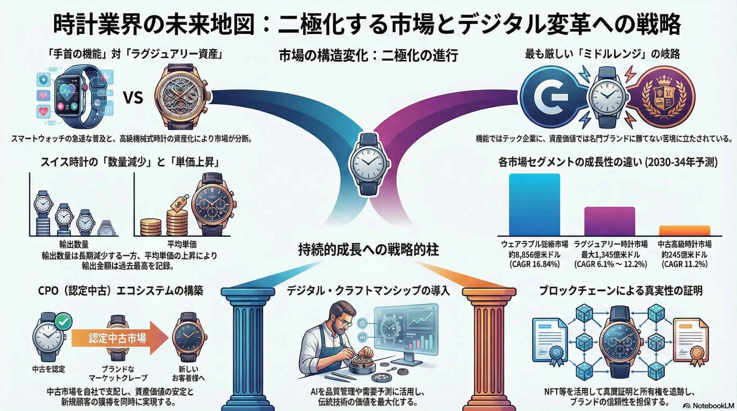 時計業界は、歴史的な転換点にある。市場は、Apple Watchに代表されるテクノロジー企業が「手首の機能(Utility)」を支配するスマートウォッチ市場と、伝統的な機械式時計が「ラグジュアリー資産(Asset)」としての価値を増大させる高級時計市場への二極化が決定的に進行している。この構造変化は、従来の製品開発、マーケティング、流通からなるバリューチェーンを根底から覆し、新たな競争優位の源泉を生み出している。今後の勝敗を分けるのは、急成長する認定中古(Certified Pre-Owned: CPO)市場の支配、デジタル技術を駆使した顧客体験(CX)の深化、そしてブランドの真実性(Authenticity)を次世代の顧客価値観に合わせて再定義し、伝達する能力である。