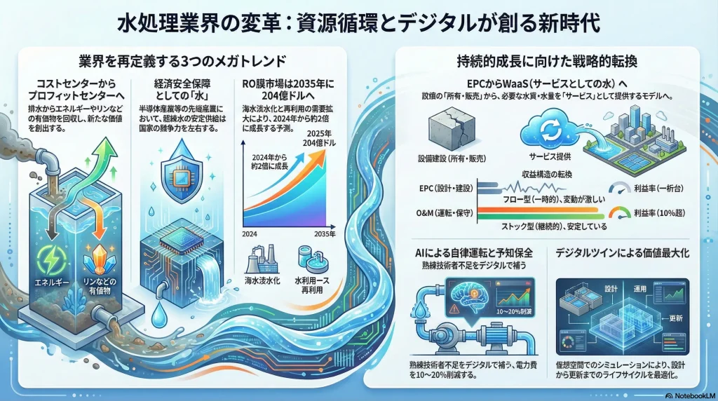 水処理業界は、社会インフラとしての安定性を維持しつつも、従来の「コストセンター」から脱却し、水・エネルギー・有価物を回収し、データを活用して新たな価値を創出する「プロフィットセンター」へと転換する歴史的な変曲点にあります。この変革を主導するのは、以下の3つの潮流が複合的に作用した結果です。